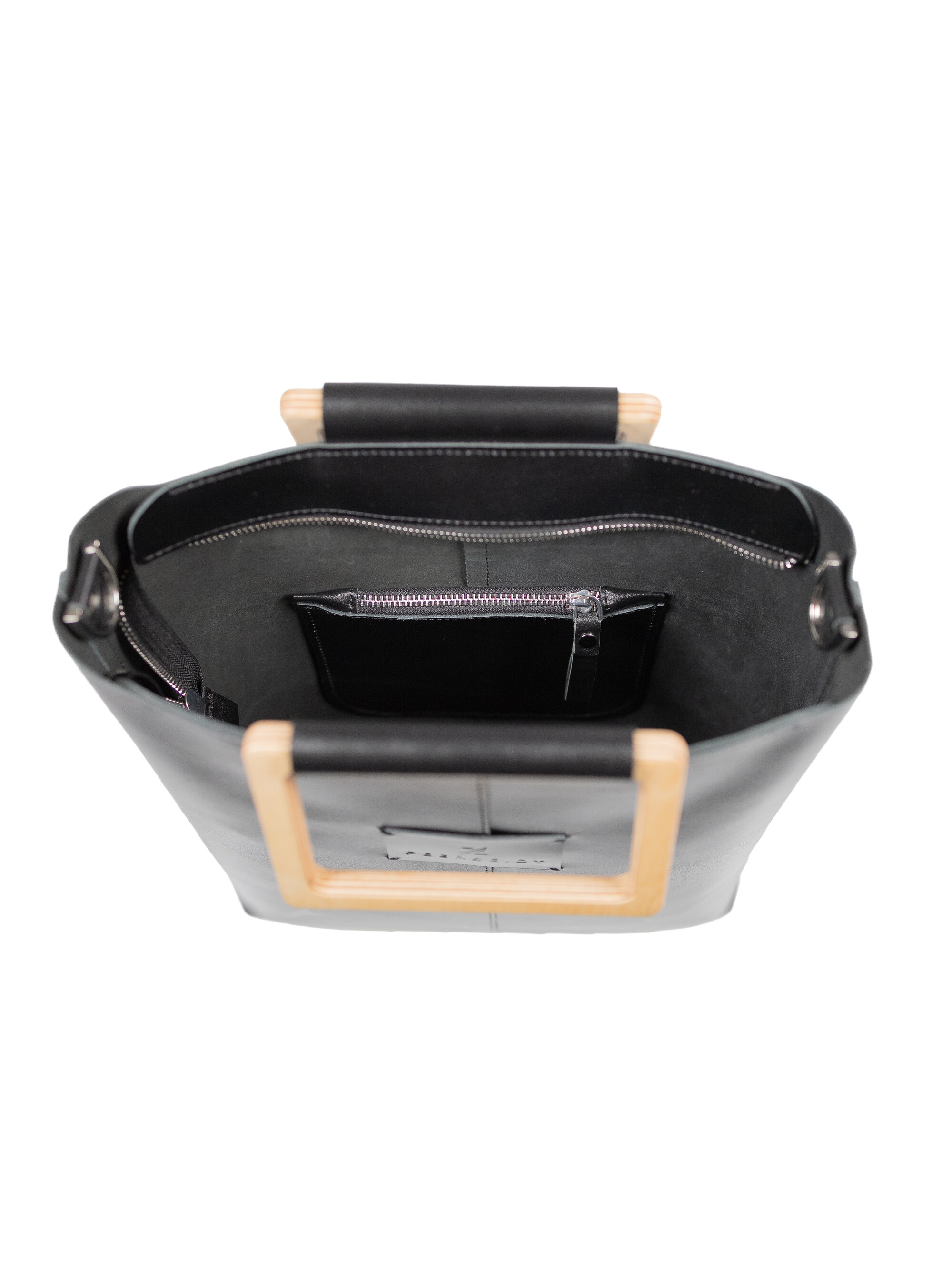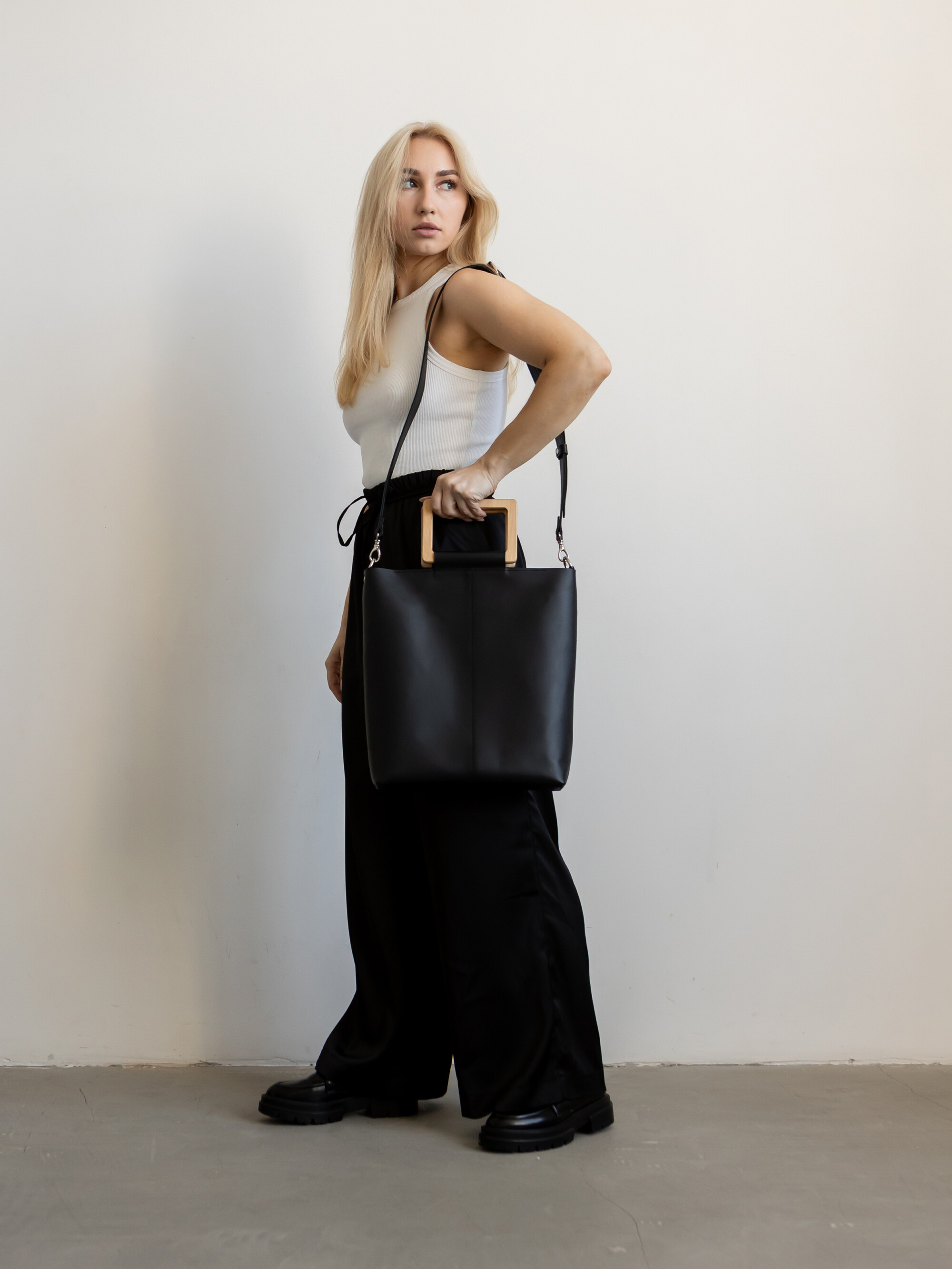 Charakterystycznym elementem torby są drewniane uchwyty z europejskiego buku, zabezpieczone naturalnym olejem i woskiem Carnauba – trwałe, lekkie i przyjemne w dotyku. Ten subtelny detal dodaje jej wyjątkowego, organicznego uroku i przywołuje skojarzenia z naturą oraz rzemieślniczym kunsztem.